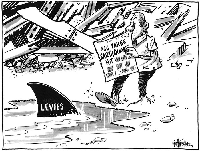 A man walks away from a scene of destruction after an earthquake; he is reading a newspaper whose headline is 'ACC takes earthquake hit' and because he is not looking where he is going he is about to step into the sea in which lurks a shark that represents 'levies'. A second version has the shark representing 'Nick Smith'. Context - The second Christchurch more devastating earthquake of 22 February 2011 that followed an original earthquake on 4 September 2010. Levy changes from April 1 will give businesses discounts or penalties on their workplace ACC levies based on a three-year claims history but ACC Minister Nick Smith said today that the quake would be declared an "adverse event" so Christchurch employers would not be unfairly hit with a levy increase, unless they contributed materially to an employee's injuries. (NBR 10 March 2011) Two versions of this cartoon are available Quantity: 2 digital cartoon(s).