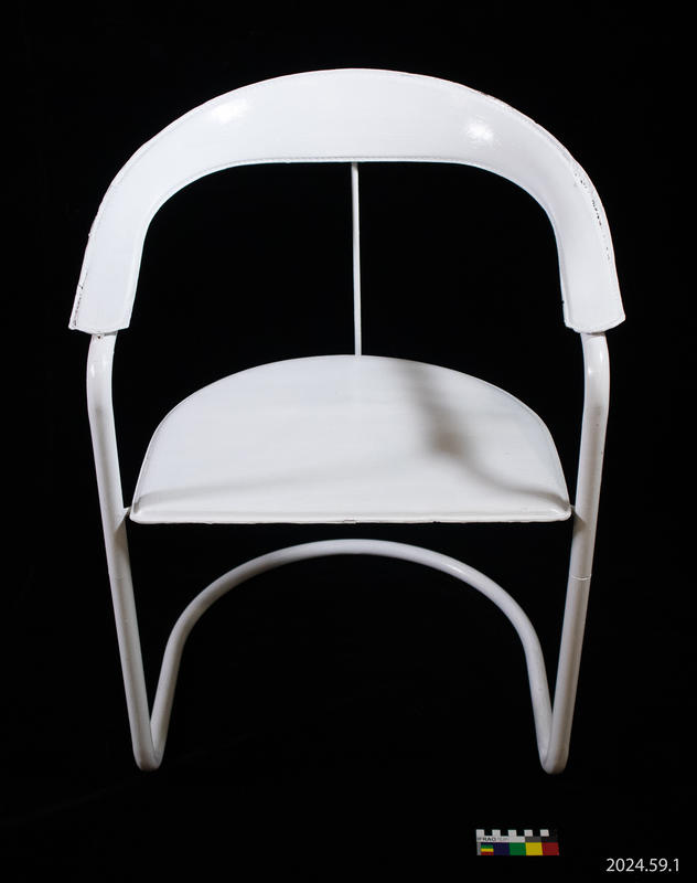 One metal chair with fabric components that has been painted white. This chair was part of the 185 Empty Chairs art installation which consisted of 185 different white chairs that represented those who died as a result of the Christchurch earthquake on 22nd February 2011.
