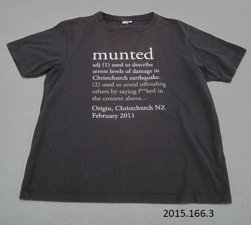 One blue cotton T-shirt with white and grey printed text on the front explaining the term munted. The T-shirt was created in response to the 22 February 2011 earthquake and this example was worn by Mayor Bob. Worn by