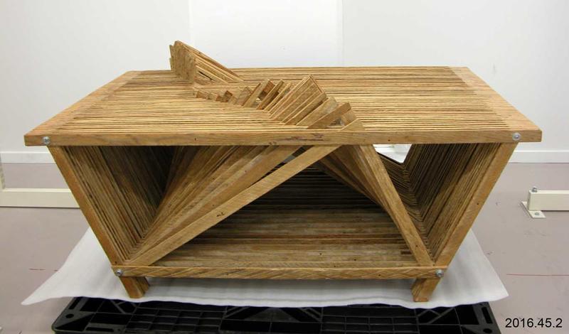 Table: Lath Coffee Table One rectangular coffee table made from lath timber. A ridgeline runs along the top of the table: the ridgeline could be seen as a mountain range or a seismograph reading. View the original item