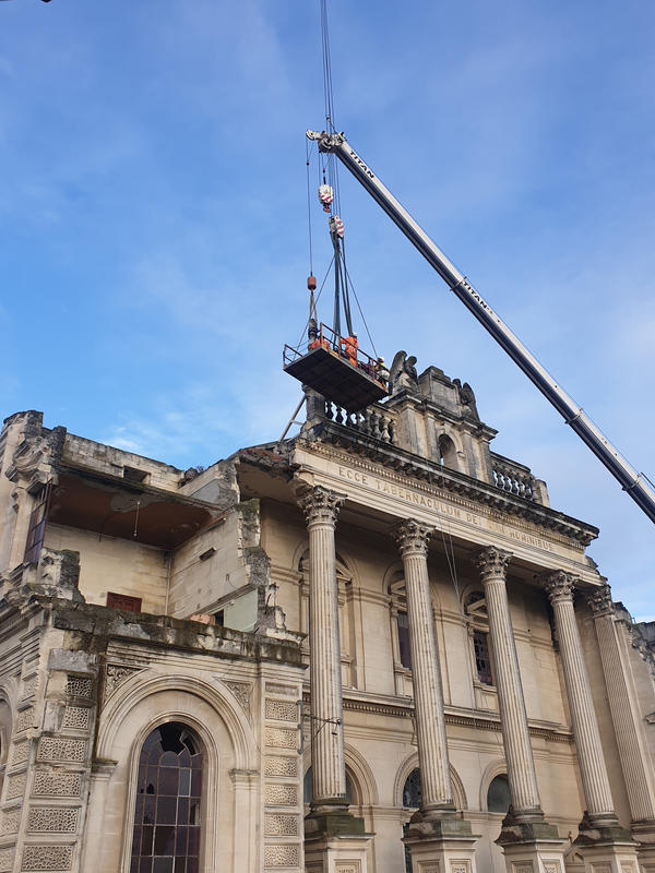 One digital photograph showing a crane arm and workers in a cage during the salvage of the exterior angels from atop the Cathedral of the Blessed Sacrament. The large intact columns at the entrance of the Cathedral can be seen in the photograph. Taken by the Catholic Diocese of Christchurch in September 2020.