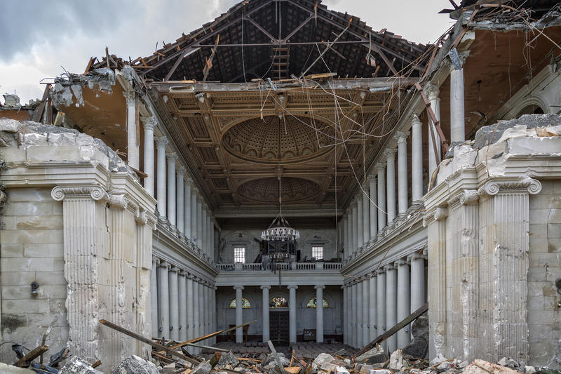One digital photograph showing the Cathedral of the Blessed Sacrament partially demolished. The interior is visible and lined with intact columns. Taken by photographer Helen McLeod in October 2020.