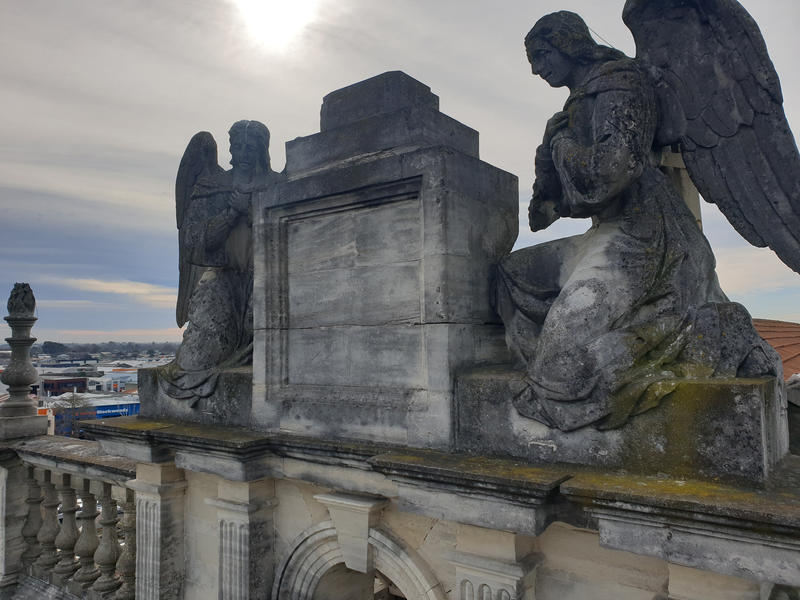 One digital photograph showing the two angels atop the Cathedral of the Blessed Sacrament. The plinth that supports the cross stands empty between the angels. Taken by the Catholic Diocese of Christchurch in August 2020 before the angels were salvaged from the building.