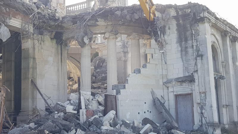 One digital photograph showing the demolition of the Cathedral of the Blessed Sacrament. A digger arm and nibbler claw can be seen in the photograph removing stone from the exterior, intact columns and ionic column capitals can be seen inside. Taken by the Catholic Diocese of Christchurch in September 2020.