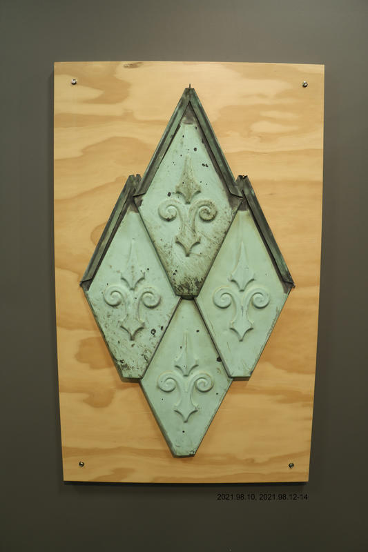 One diamond shaped interlocking roofing tile with stamp pressed fleur-de-lis (stylised lily flower). This was one of the roofing tiles from the Cathedral of the Blessed Sacrament's northern or southern bell towers and was salvaged prior to the Cathedral's demolition in 2020.