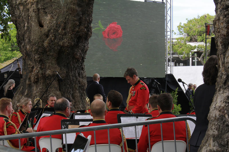 One landscape colour digital photograph taken 22 February 2017 showing brass band members at the Canterbury Earthquake Memorial Service. Behind the band is a digital screen showing an image of flowers floating in the Avon River.