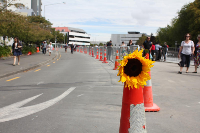 Digital Photograph: Sunflower Atop a Road Works Cone One landscape colour digital photograph taken 22 February 2017 showing a sunflower sitting atop a road works cone as part of the Canterbury Earthquake Memorial Service. View the original item