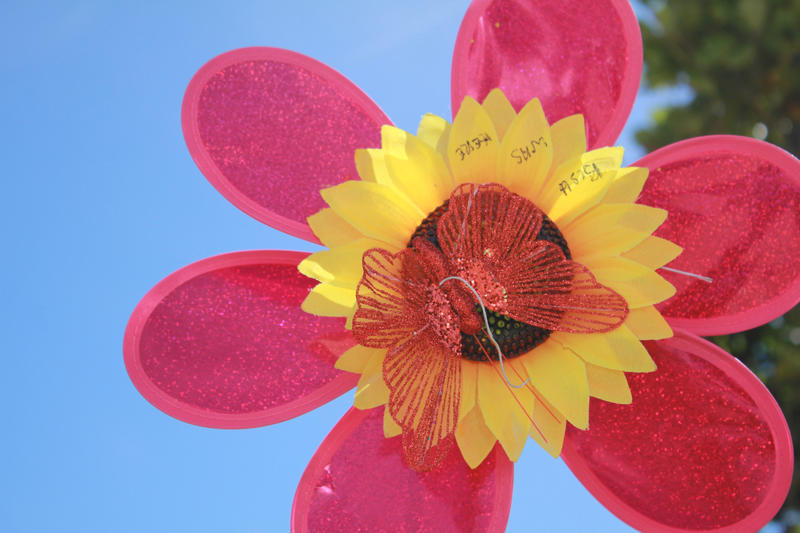 One landscape colour digital photograph taken 22 February 2017 showing a windmill attached to an earthquake memorial trellis by Karen Bishop in memory of her son Andrew Bishop at the site of the former Canterbury Television building.