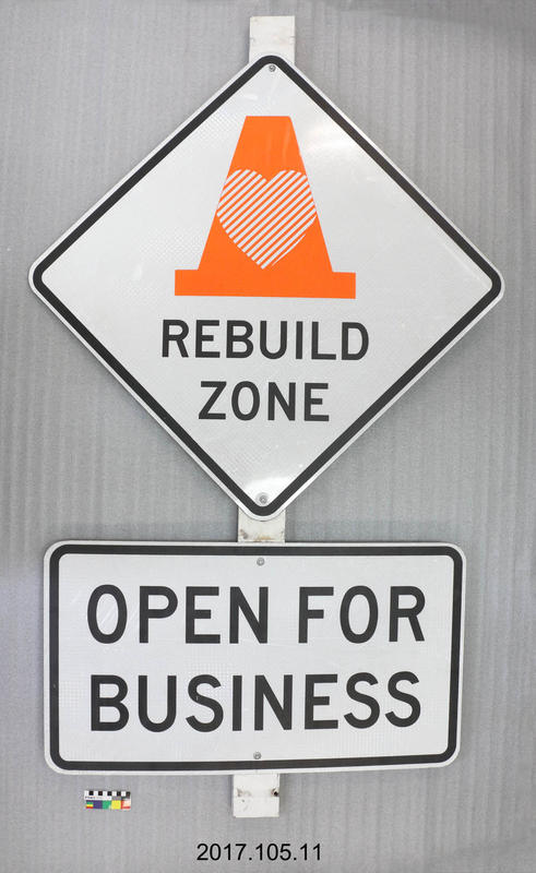 Road Sign: Rebuild Zone One white metal road sign with a picture of an orange road cone with a heart on it. The sign reads 'Rebuild Zone Open for Business'. View the original item