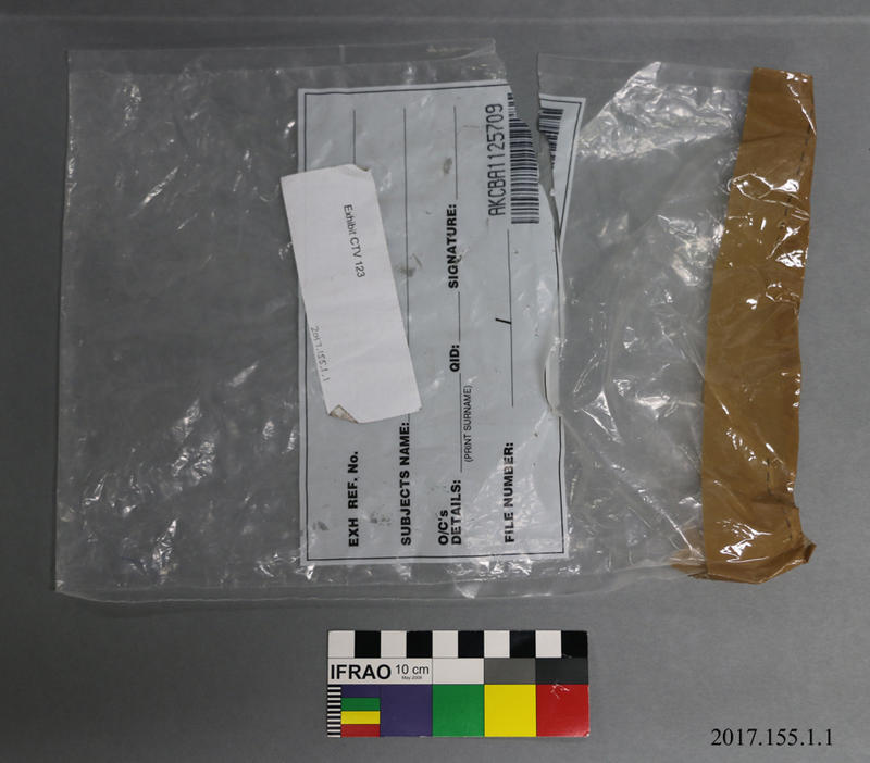 One pink and yellow Asian floral designed fabric cosmetic bag with cosmetics retrieved from the CTV building. Cosmetics include four Bobbi Brown lipstick products, two Christian Dior lipstick products, a Lancome lip treatment bottle, two cosmetic sharpeners, a pair of tweezers and a Q-tips box with cotton buds. Stored in a plastic New Zealand P...