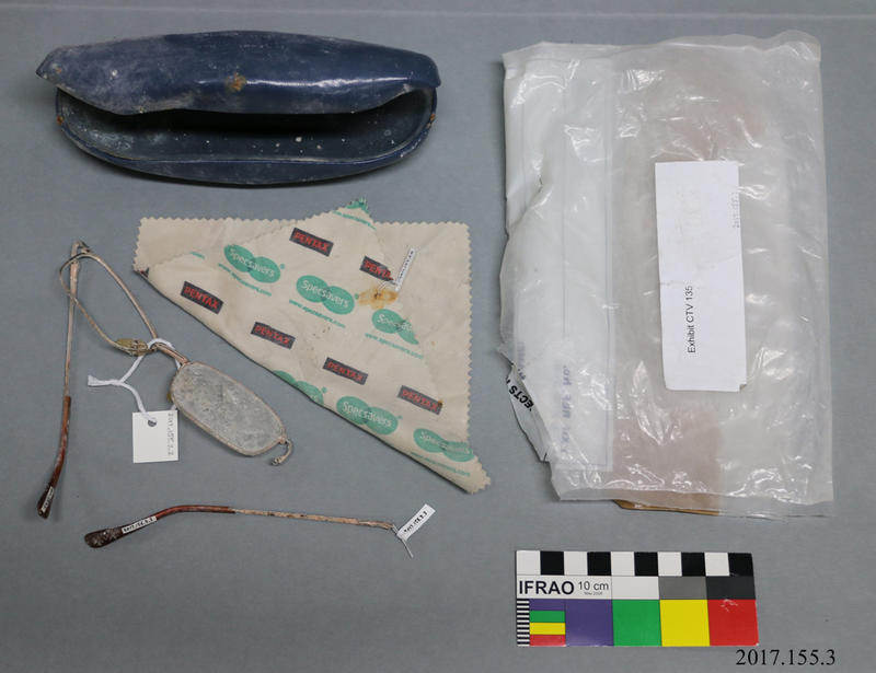 Eyeglasses and Cloth with Case: CTV Building One pair of eyeglasses with LensCrafters cleaning cloth in blue case retrieved from the CTV building. Stored in a plastic New Zealand Police exhibit bag. View the original item