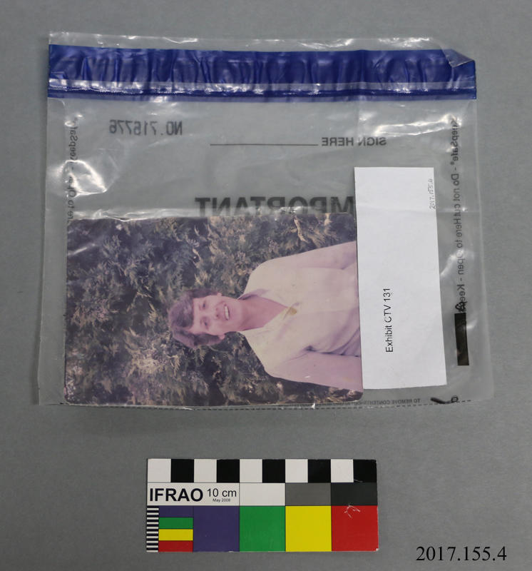 Photograph of woman One colour photograph of a smiling woman standing outside in front of a bush or tree retrieved from the CTV building. Stored in a sealed plastic New Zealand Police exhibit bag. View the original item