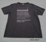 One blue cotton T-shirt with white and grey printed text on the front explaining the term munted. The T-shirt was created in response to the 22 February 2011 earthquake and this example was worn by Mayor Bob. Worn by