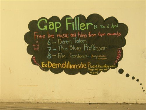 A noticeboard advertises Gap Filler's 'Film in the Gap' project.