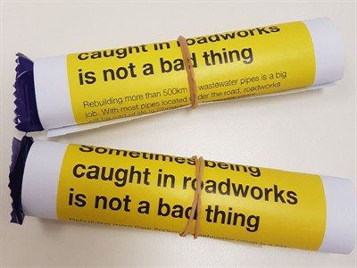 “In response to driver frustration and to encourage patience and safe driving habits during traffic detours and delays, stationary drivers were given "chocolate fish" (iconic New Zealand sweets) wrapped in a message about the project… The fish were wrapped in an information flyer about the project to help drivers understand the delay and thank them for their patience and tolerance. The slogan on the flyer was: "Doing the right thing at roadworks is as Kiwi as ... a chocolate fish.”